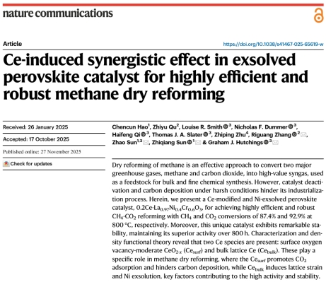 近日,在线之家 孙志强教授团队在国际权威期刊《自然-通讯》(Nature Communications)上发表了题为“Ce诱导协同作用助力脱溶钙钛矿催化剂实现高效稳定的甲烷干重整”(Ce-induced syne...