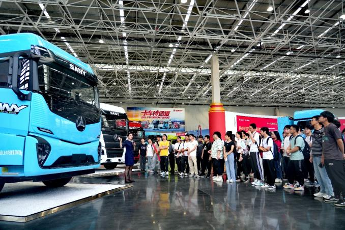 同学们刚进入展厅,便被大厅中的数辆卡车所吸引,它们其中就有近年来广受关注的氢能重卡。在介绍员的讲解下,同学们逐渐对氢能重卡的各项指标有了更全面的了解。在实现“双碳”目标的道路中,氢能重卡有着极大的优势,它拥有更加便捷的充能方式、更低的能耗以及几乎为零的碳排放。三一集团秉持着“创新”和“高品质”的理念,坚持在每一个流程上严格把关,造就了一辆辆技术先进、品质上乘的氢能重卡。