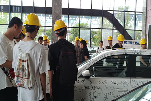 接下来,在工作人员的带领下,同学们来到了汽车的生产车间,了解到一辆汽车的生产需要经过汽车零部件的生产、模块的组装、整体雏形的查验等一系列流程。在长沙工厂,激光切割、细丝焊接、精细打磨等生产过程中需要进行的工作,都有自动化设计的机械臂来完成,在降低人力资源需求量的同时,一定程度地提升了工作完成质量,让全体同学都切实地体会到什么是科技改变世界。