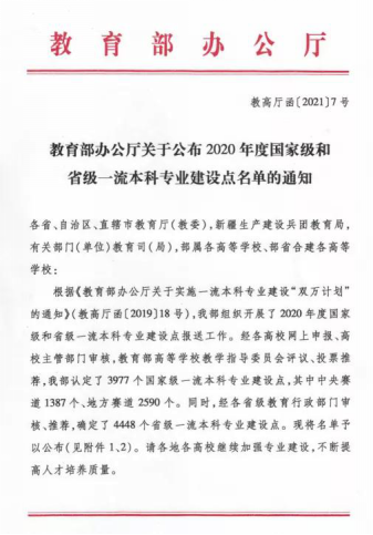近日,教育部办公厅下发《关于公布2020年度国家级和省级一流本科专业建设点名单的通知》(教高厅函〔2021〕7号),在线之家