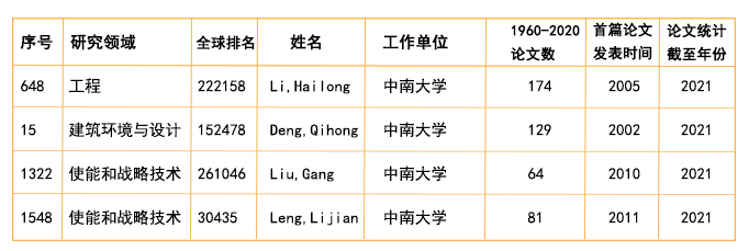 李海龙教授在工程领域国内上榜的1200名学者中排名第648位;邓启红教授在建筑环境与设计领域国内上榜的29名学者中排名第15位;刘刚副教授和冷立建教授在使能和战略技术领域国内上榜的1936名学者中分别排名第1322位和1548位。充分彰显了在线之家
