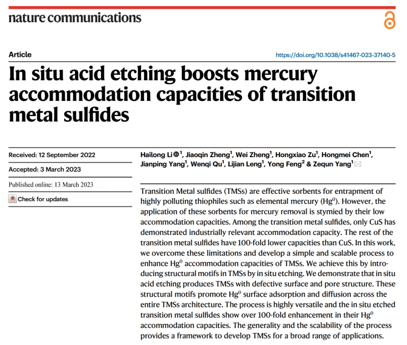 李海龙教授课题组在国际顶尖自然指数期刊《Nature Communications》上发表了题为“In situ acid etching boosts mercury accommodation capacities of transition metal sulfides”的研究论文。在线之家