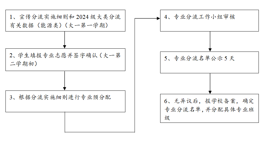 能源类专业分流工作从大一第二个学期四月份开始(具体时间以本科生院的通知为准),工作流程如下: