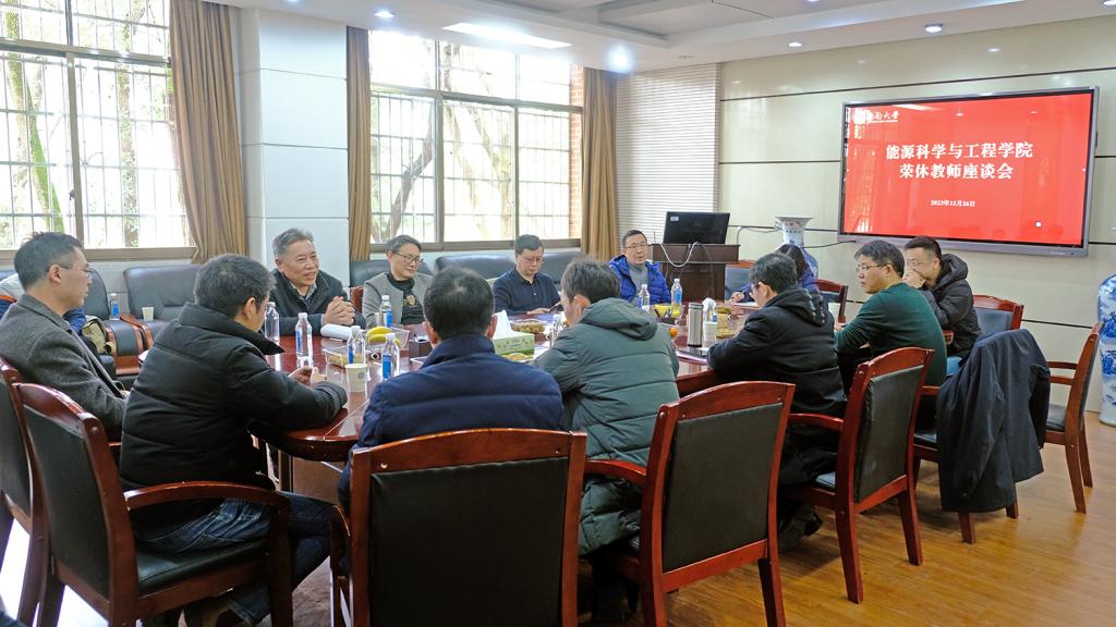 在能源楼206会议室召开2023年荣休教师座谈会。廖胜明、蒋绍坚、周乃君、黄学章四位荣休教师,在线之家