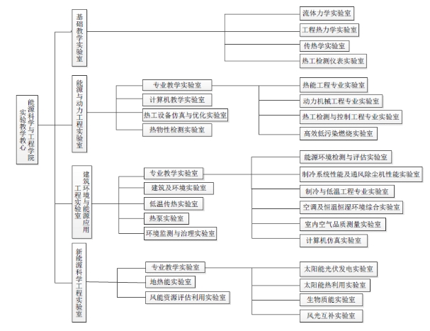 面向本科生教学——热工基础实验室(包括流体力学实验室、工程热力学实验室、传热学实验室、热工检测仪表实验室)、专业教学实验室(包括热能工程专业实验室、动力机械工程专业实验室、热工检测与控制工程专业实验室、高效低污染燃烧实验室)、计算机实验室;
